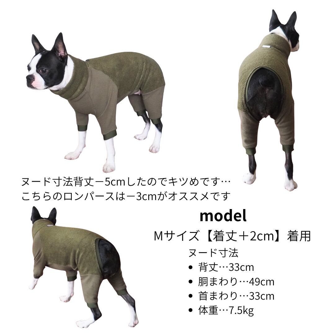 全部フリースの方が暖かいのですが、アクティブなボストンテリアにとって全身フリースは枯葉が付いたり砂が付いたり…悩んだ結果、フリースとフライスの切り替えデザインにしました。