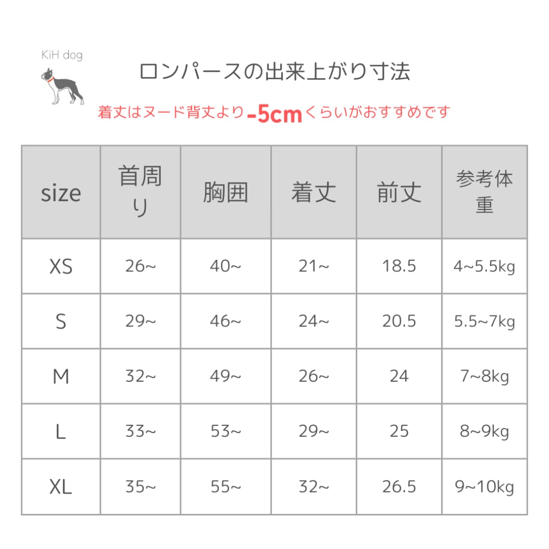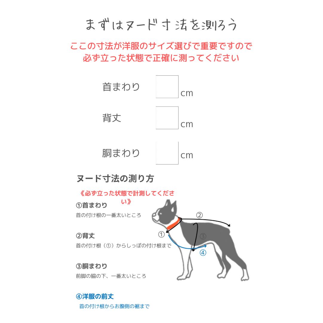 お尻周りの開きを広くしたので、着丈はわんちゃんのヌード寸法の背丈より5cmほど短めを選んでいただくのがベストです。