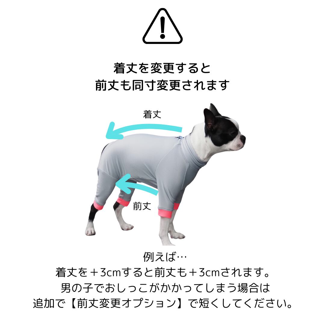 お尻周りの開きを広くしたので、着丈はわんちゃんのヌード寸法の背丈より5cmほど短めを選んでいただくのがベストです。